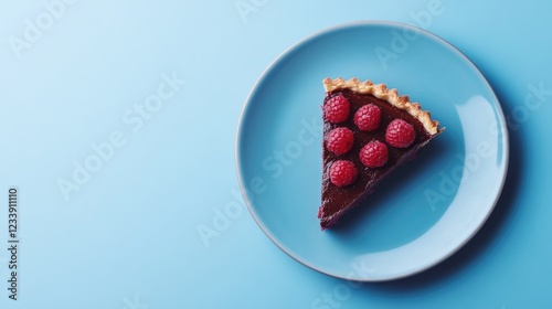 chocolate, tart, slice, raspberry, blue, plate, dessert, food, sweet, epicure, pastry, confection, fresh, berry, background, light, space, delicious, indulgent, culinary, treat, decadent, nourishment, receipe, plating, elegant, vibrant, wholesome, homemade, delightful, chocolate, sugar, topping, snack, serving, artistry, design, presentation, eatery, luxury, colourful, appetising, feast, seasonal, rich, texture