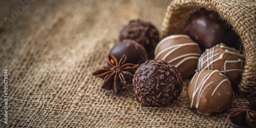 Chocolate truffles in various shapes on a textured burlap background with anise flowers and copyspace ideal for Chocolate Day promotions