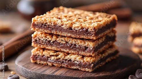Chocolate-filled oat flapjacks stacked on rustic board. Sweet and rich homemade bars, delicious twist for celebrating National Flapjack Day with chocolate lovers