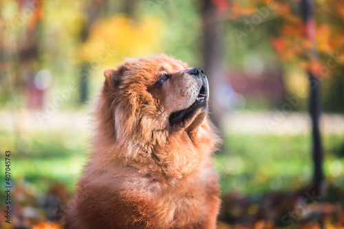 Chow Chow male dog sitting on the ground and looking to the owner. Autumn walk, selective focus