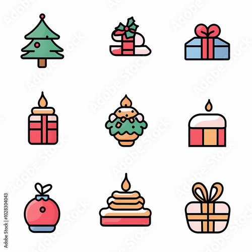 christmas, icon, vector, gift, set, holiday, tree, decoration, christmas, illustration, icon, winter, symbol, celebration, design, bell, hat, snowman, box, santa, star, candy, year, candle, cartoon