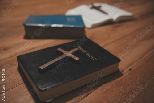 Christian group are praying to god with the bible and sharing the gospel. Concept of faith for god.