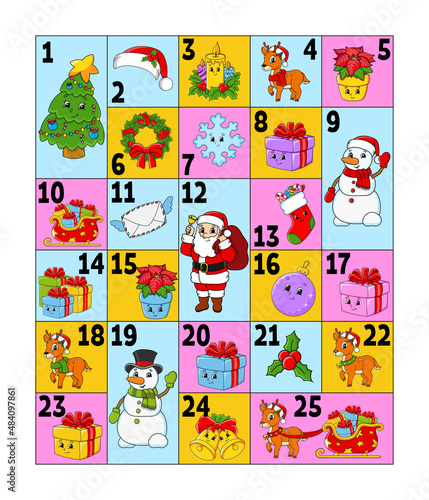 Christmas advent calendar with cute characters. Santa claus, deer, snowman, fir tree, snowflake, gift, bauble, sock. Cartoon style. With numbers 1 to 25. Vector illustration. Holiday preparation.