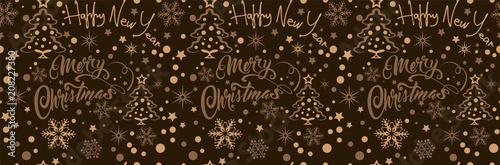 Christmas and New Year Seamless Pattern. Holiday Background Dark Black Colors. Horizontal, Drawing: abstract, Christmas tree, text, snowflakes, stars, dots