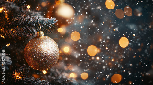 Christmas and New years eve Background. Beautiful Wide Angle Holiday Template with Christmas ball on fir tree and highlights. Panoramic classic header Web banner with copy space for design. Close up