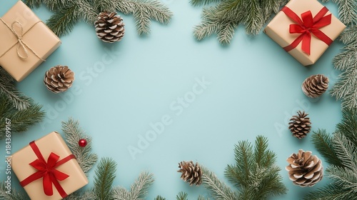 Christmas background with pine cones, gifts, and tree branches on a pastel blue background, bright festive card template design