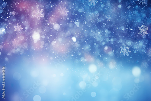 Christmas background with snowflakes and bokeh. Winter holidays celebration backdrop with snow on blurred background.