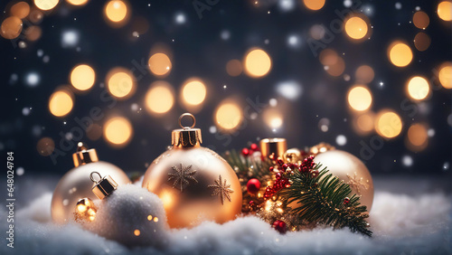 Christmas background with spruce branches decorated with Christmas baubles, snowflakes, and lights.