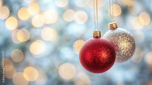 Christmas balls hanging on an out of focus background