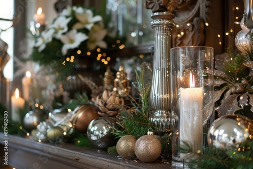 Christmas candle burning brightly on mantelpiece with silver and gold ornaments and bokeh lights in background