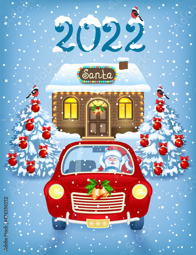 santa, car, christmas, house, workshop, tree, spruce, fur, fir, holiday, claus, automobile, automotive, machine, passenger car, merry, window, door, bungalow, filed, exterior, villa, lamp, street, grandfather, frost, winter, snow, snowfall, new, year, card, celebration, greeting, cartoon, happy, vintage, festive, transport, bell, berry, holly, retro, 2022, bullfinch, bird, vector