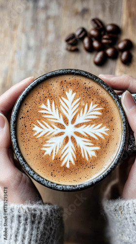 Christmas coffee cup with snowflake latte art held by hands on wooden table creates cozy festive atmosphere