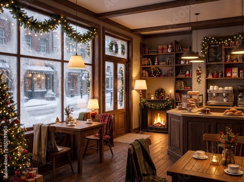christmas, cafes, interior, winter, snow, cafes, cosy, fireplace, window, decoration, tree, holiday, festive, warm, wooden, furniture, table, chair, garland, light, morning, shop, eatery, view, street, christmas, season, celebration, comfort, beverage, cup, latte, pastry, counter, shelf, book, peaceful, relaxing, architectural, design