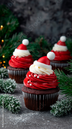 cupcake, christmas, holiday, santa, frosting, red, white, dessert, festive, sweet, winter, celebration, decoration, food, baking, chocolate, icing, snow, pine, seasonal, cute, pastry, background, cheerful, new year, snowy, christmas tree, epicure, cosy, sugar, bakery