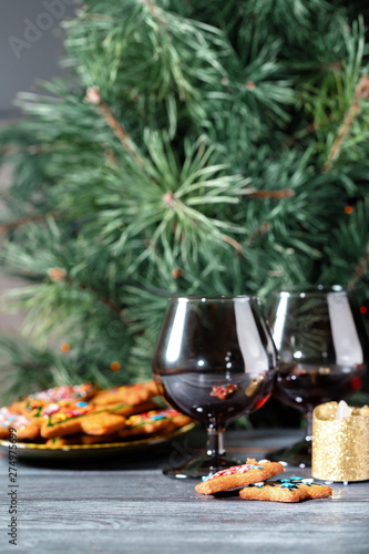 Christmas dessert - a traditional cookie on the background of a green Christmas tree.