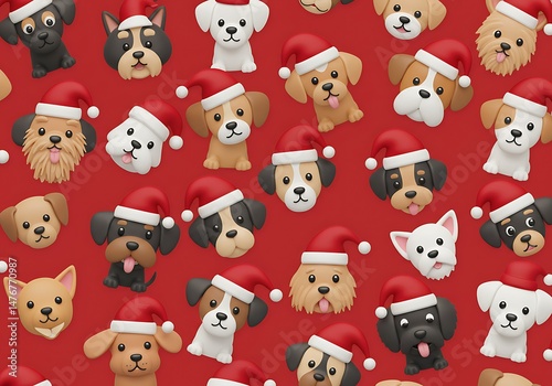 dog, dog, puppy, puppy, santa, hat, hat, holiday, festive, red, background, pattern, repeat, texture, cute, adorable, cartoon, illustration, three-dimensional, render, rendering, digital, art, graphic, design, image, season, pet, animal, canino, cheerful, merry, joyful