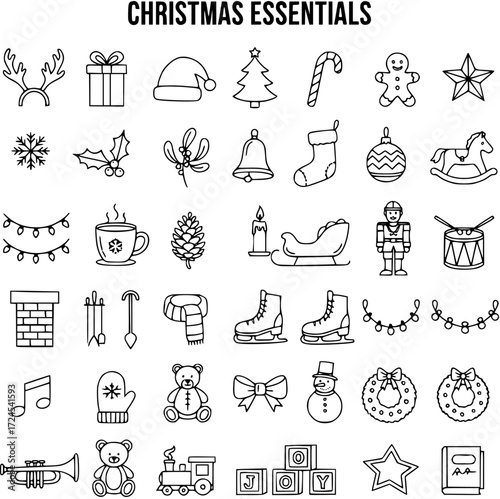 holiday, christmas, holiday, icon, vector, line, drawing, doodle, christmas, essential, symbol, design, clip, art, graphic, illustration, outline, decoration, season, festive, winter, celebration, set, reindeer, gift, santa, tree, candy, gingerbread, star, snowflake, holly, mistletoe, bell, stocking, ornament, horse, light, cup, cone, candle, sleigh, nutcracker, drum, chimney, fire
