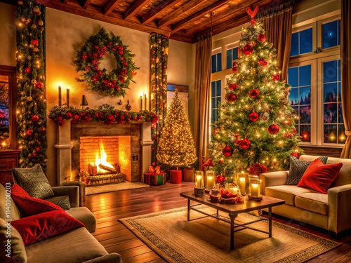 Christmas Fireplace Living Room Decor: Cozy Night Scene, Festive Interior Design, Holiday Home