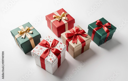 Christmas Gift Boxes Wrapped in Colorful Wrapping Papers on White Background, Christmas Holiday Festive concept.