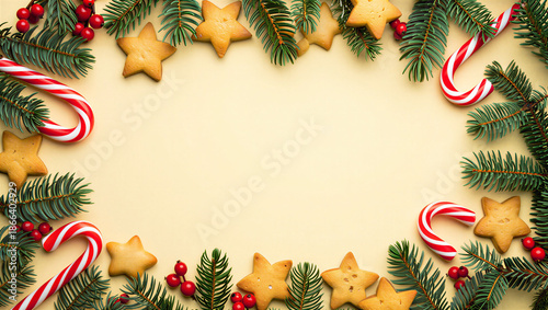 christmas, holiday, festive, winter, celebration, frame, border, evergreen, pine, branch, berry, red, green, candy cane, peppermint, cookie, star, gingerbread, treat, sweet, decoration, ornament, season, seasonal, december, greeting, invitation, card, background, design, element, space, blank, empty, copy space, traditional, jolly, happy, merry, cheerful, topview, overhead, bright, cosy, arrangement, graphic