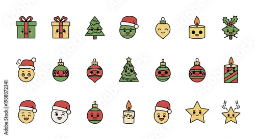 Christmas icons including gifts, trees, ornaments, and smiling faces are displayed.
