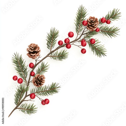 Christmas pine branch with pine cones and red berries isolated on white background.