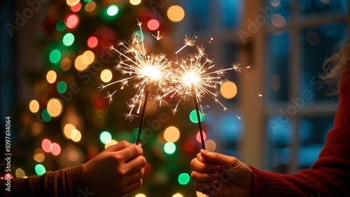 Christmas Sparkler Magic, Festive Hands Holding Sparklers Before a Lit Tree