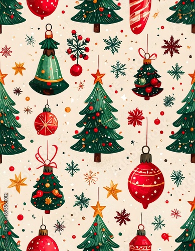 christmas, ornament, tree, pattern, festive, red, green, beige, snowflake, star, decor, holiday, design, vintage, cute, hanging, ball, illustration, drawing, gift, background, celebration, patterned