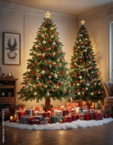 Christmas tree decorated with ornaments and garlands in a cozy room, warm lighting, cozy room, christmas tree