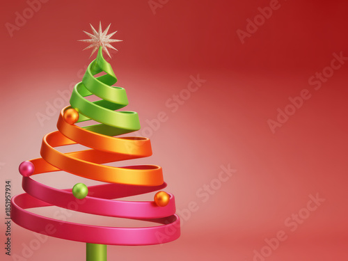 christmas tree, christmas, holiday, spiral, ribbon, ornament, star, festive, celebration, greeting card, modern, minimalist, abstract, design, winter, new year, december, colourful, red, green, orange, magenta, pink, background, copy space, digital artwork, seasonal, decoration, eve, concept