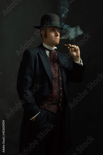 Cigar smoking young man in stylish vintage Victorian clothes stands in a room in front of a dark gray wall.