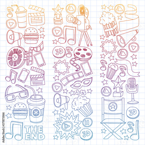 cinema, film, vector, hand, drawn, motion picture, object, goggles, design, three-dimensional, camera, entertainment, popcorn, video, vignetting, star, ticket, filmstrip, multimedia, symbol, art, background, abstract, icon, cartoon, television, flower, music, computer, car, retro, paper, television, isolated, motion, signs, megaphone, screen, equipment, action, doodle, industry, light, theatre, element, illustration, clapboard, director