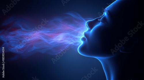 breath, energy, profile, glowing, neon, blue, purple, smoke, light, soul, spirit, consciousness, ai, cyborg, avatar, meditation, emanating, life, digital artwork, futuristic, mystical, aethereal, darkness, to illuminate, aura, visualisation, science fiction, human, essence, vibrant, flow, trail, cosmic, nebulous, abstract, power, vitality, brain, woman, people, concept, anatomy, hair, art, psychology, imagination