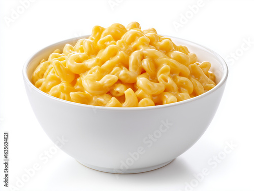 Cinematic shot of a bowl of mac and cheese, creamy texture visible, clean white background, full HD.