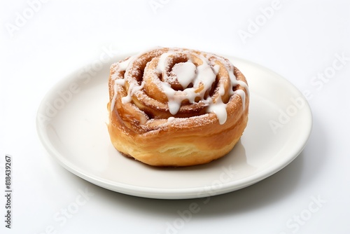 Cinnamon bun on a plate on white background.
