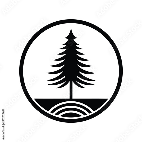 tree, evergreen, pine, fir, conifer, icon, symbol, logotype, design, graphic, circular, round, nature, forest, wood, environmental, ecology, illustration, vector, black, white, minimalist, simple, clean, modern, geometric, abstract, badge, emblematic, silhouette, isolated, background