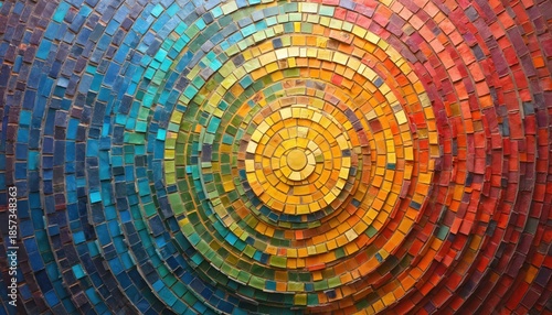 mosaic, tile, circular, pattern, abstract, colourful, art, background, design, texture, spiral, concentric, ring, blue, green, yellow, orange, red, warm, cool, vibrant, bright, wall, decoration, geometric, modern, graphic, decorative, craft, hand-made, interior, architecture, detail, symmetry, radial, gradient, spectrum, palette, energy, movement, flow, creative, ornament, craftsmanship, artistic, surface, finish, studio