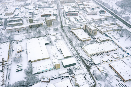 aerial, winter, snow, industrial, building, area, urban, city landscape, warehouse, factory, plant, production, distribution, manufacturing, industry, business, cold, white, district, roof, modern, town, city, street, architecture, panorama, road, season, car, ice, house, fog, day, transportation, commercial, car park, suburb, garage, landscape, background, belarus, minsk, up high, view, drone