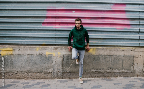 City portrait of charismatic hipster guy wearing green (watercolor) blank hoodie with space for your logo or design. Mockup for print