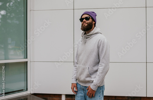 City portrait of handsome hipster guy with beard wearing gray blank hoodie or sweatshirt and hat with space for your logo or design. Mockup for print