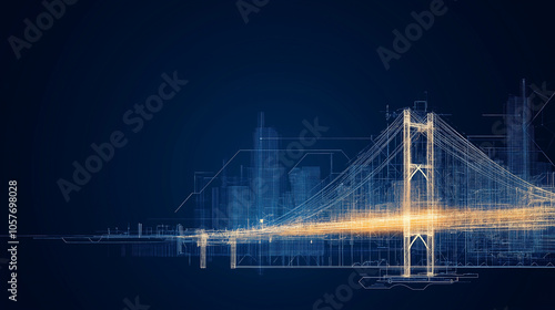 bridge, city landscape, futuristic, wireframe, design, city, architecture, modern, technology, urban, construction, infrastructure, network, connection, line, abstract, digital, illustration, graphic, background, skyline, building, light, glow, orange, blue, dark, night, perspective, engineering, structure, transportation, development, progress, innovation, metropolis, sophisticated, elegant, contemporary, global, globalisation, frisco, water, bay, suspension, river, sky, california, sea