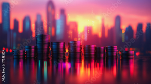 Cityscape of Success: A mesmerizing cityscape illuminated by the vibrant hues of a setting sun, with towering stacks of coins symbolizing financial prosperity and growth.