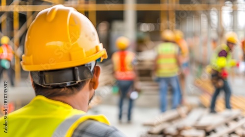 Civil engineer leading a site safety training, workers in safety gear gathered around, emphasizing safety education and compliance