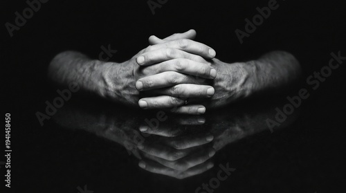 hand, black-and-white, contemplation, prayer, person, adult, ageing, wrinkled, vein, ring, wedding band, dark background, monochrome, low key, studio shot, indoor, thinking, sorrowful, grief, hope, faith, emotion, stress, sharpened, concentration, solemn, serious, pensive, introspection, quiet, peace, patience, support, oneness, connection, humanity, wisdom, closeup, cropped, front view, nobody, man, male