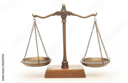 Classic brass scale with two bowls in balance, symbolizing justice, on a white background.