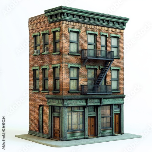 Classic Brick Three Story Building Architectural Model with Fire Escape and Storefront