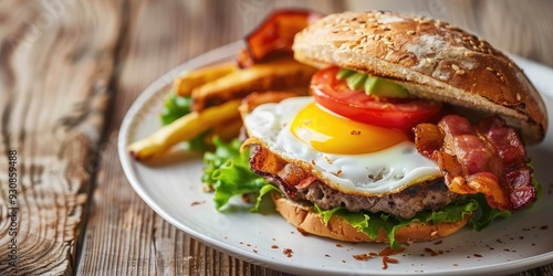 cafes, classic, breakfast, bacon, egg, burger, cheese, roasted, tomatoes, avocado, white, plate, wooden, table, food, meal, dish, savoury, delicious, eatery, brunch, epicure, side, fresh, ingredient, culinary, dining, tasty