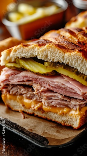 Classic Cuban Delight: A Flavorful Cuban Sandwich with Ham, Pork, Cheese, and Pickles on a Toasted Roll - A Taste of Havana's Culinary Tradition