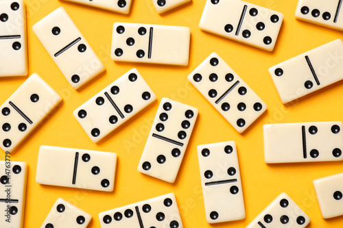 Classic domino tiles on yellow background, flat lay