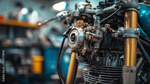 motorcycle, engine, close, up, detail, shot, classic, bike, machine, mechanic, repair, vintage, part, metal, chrome, gold, blue, grey, wire, cable, component, cylinder, piston, gear, shaft, sprocket, bolt, nut, screw, oil, fuel, system, technology, engineering, power, speed, transportation, vehicle, workshop, garage, background, blurry, sharpened, depth, field, image, photo